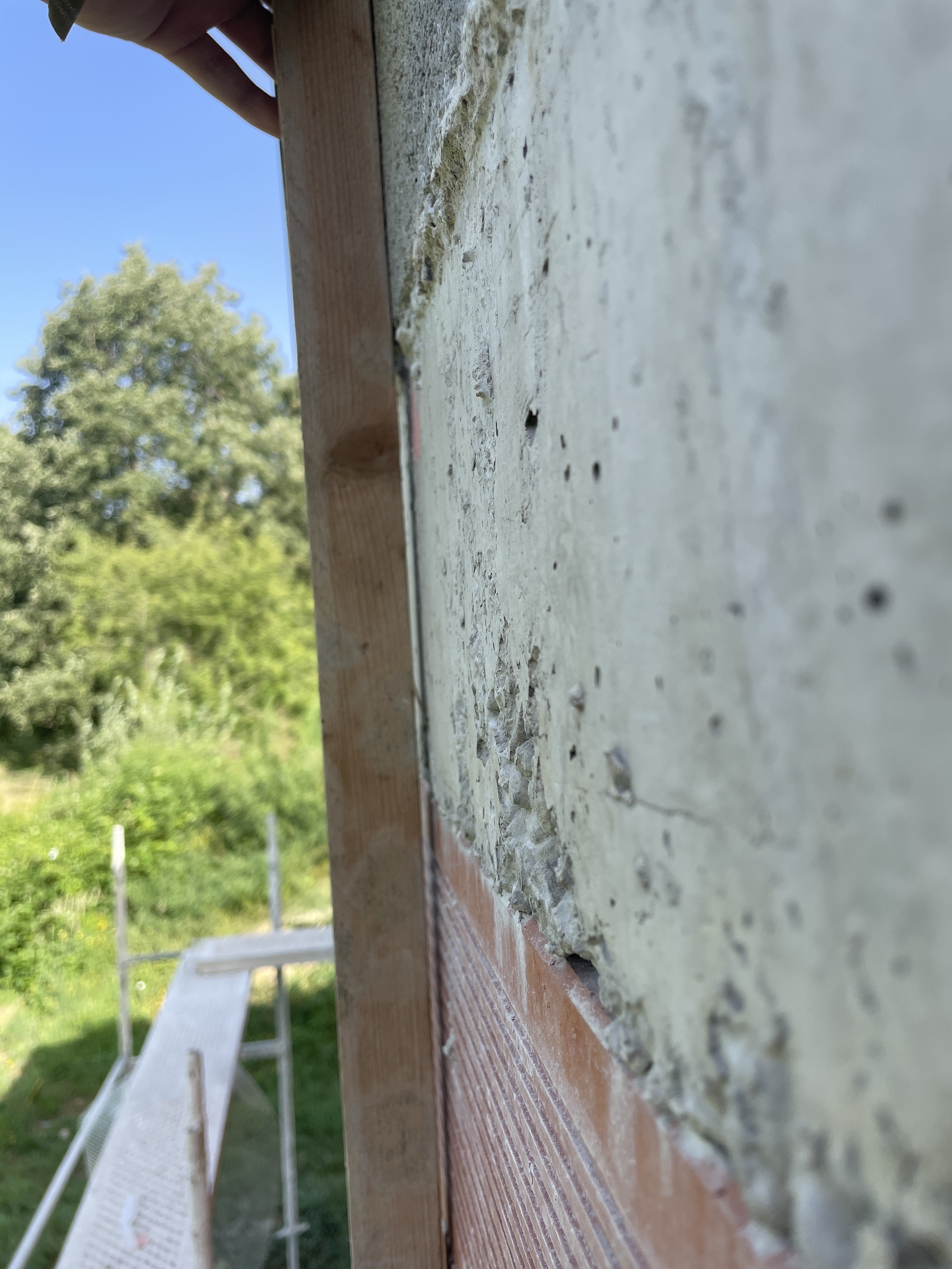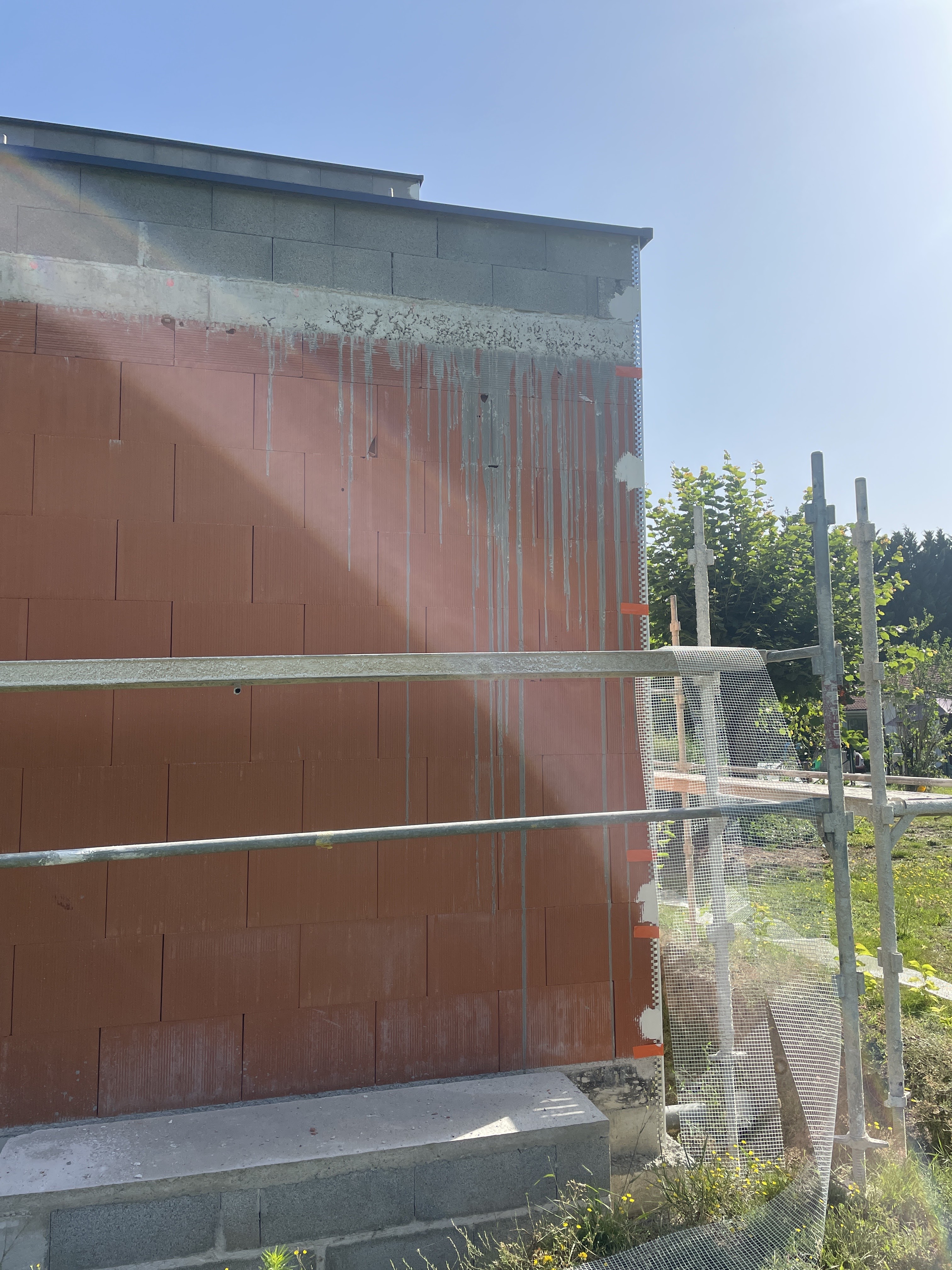 Je vois que les maçons ont un séreux problèmes avec le décoffrage ils n’élève pas les ferraille qui dépasse, laisse dés croûton de béton bien dégoulinant sur la façade les coffre sur toute les ouvertures sont dedans de au moins 5mm. Si vous ne voulais pas prendre de plus value sur votre enduit après cette entreprise est à éviter!