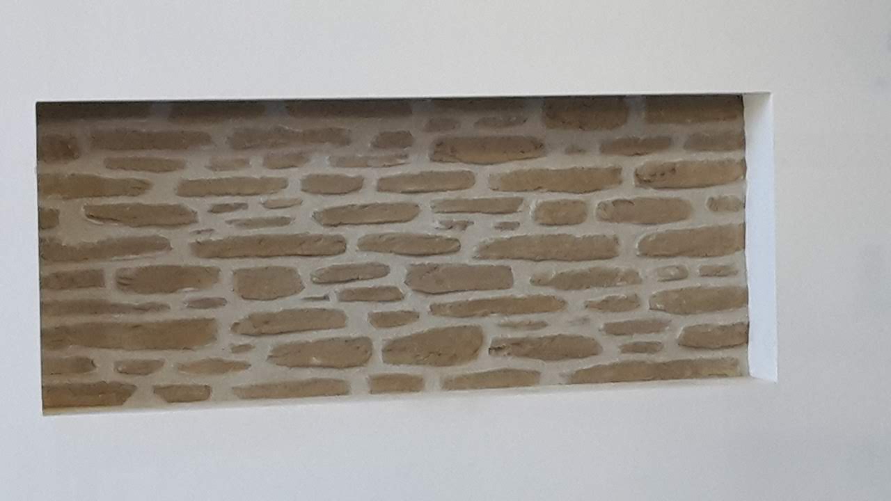 Manifique rendu de notre mur. Le patron à de très bonne idée. Conseil très bien. On va rajouter de la lumière pour faire resortir les pierres.